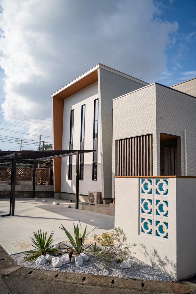 機能性とデザイン性を兼ね備えた、少し贅沢な外構を実現します。まず、家の顔となる「門柱」を設置し、玄関へのアクセスをスムーズにします。そして、車を安全に駐車できる「駐車場」と、天候に関係なく愛車を守る「カーポート」を整備。さらに、「目隠しフェンス」を設置することでプライバシーを守り、外部の視線から守られた安心感を提供します。最後に、温かみのある「植栽」を取り入れ、自然な美しさを加えることで、家全体の印象が一層引き立ちます。