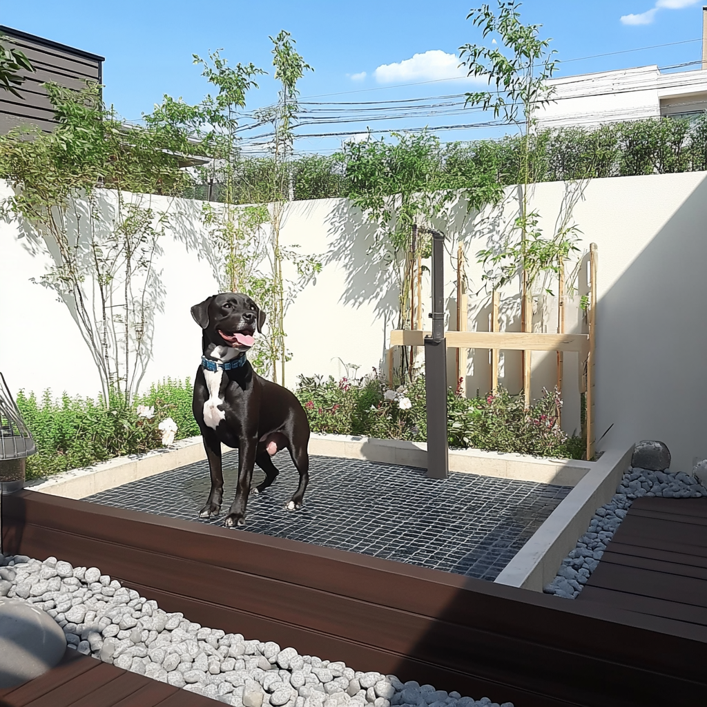 ペットとの暮らしをもっと快適に、そして安全にするための外構プランです。まず、「生芝」を敷くことで、ペットが自然の中で走り回れる健康的なスペースを提供します。「テラス」を設けることで、屋外でも快適に過ごせるスペースができ、ペットとのんびり過ごすことができます。「飛び出し防止策」を取り入れ、ペットが道路に飛び出してしまう心配を防ぎます。また、ペット専用の「洗い場」を設置することで、散歩後の汚れた足を簡単に洗えるようにし、衛生的な環境を維持できます。