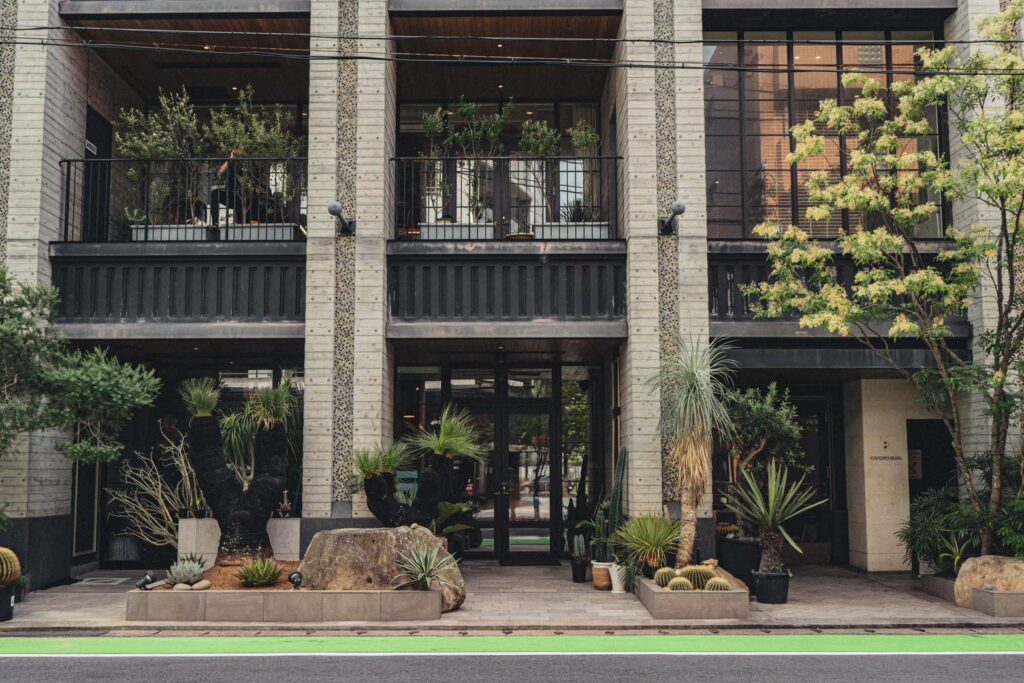企業オフィスの庭にブラックボーイを、圧倒的な存在感で非日常を演出