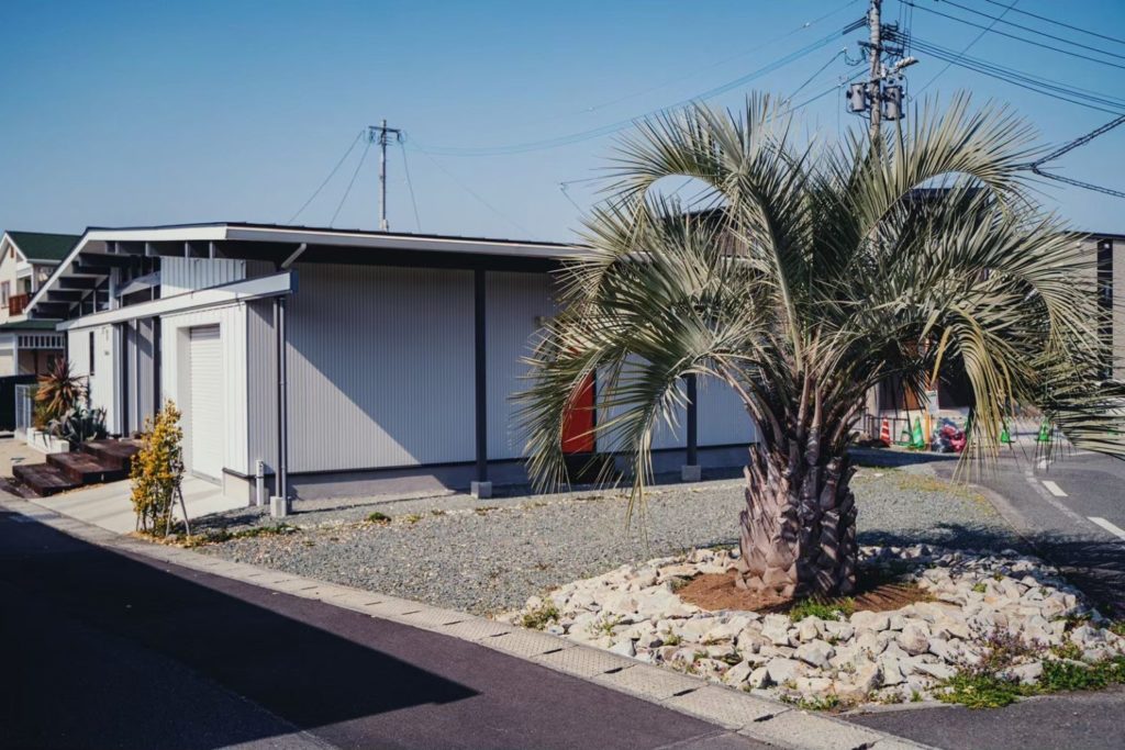 ファサードにはインパクトのあるヤシの木を大胆に配置し、白い花ブロックで抜け感とリズムを演出。