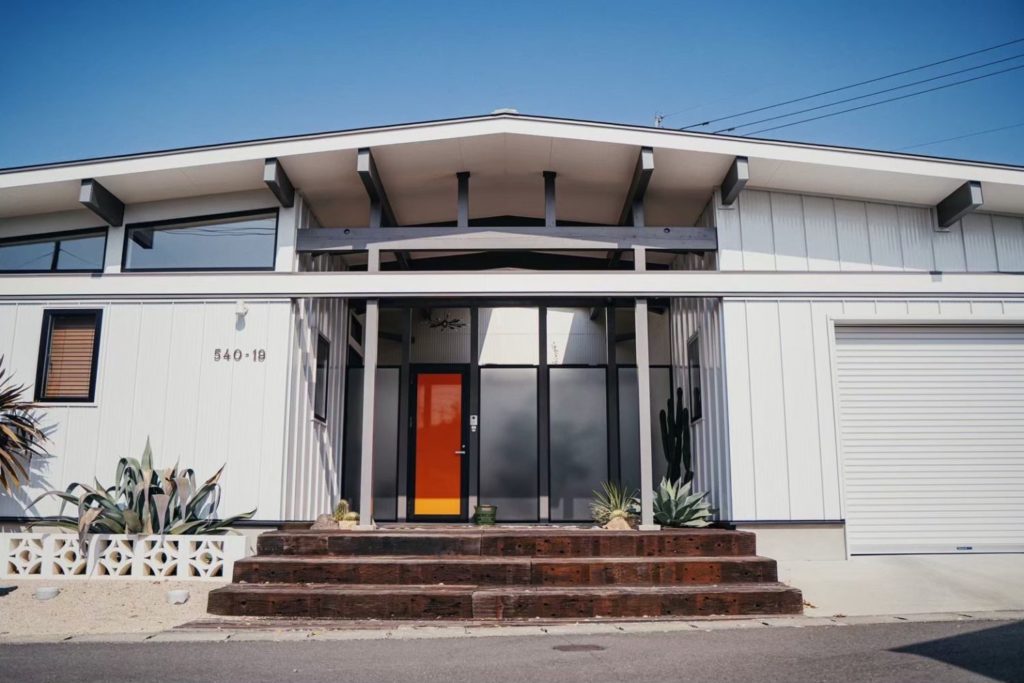 直線的な屋根ラインと白を基調とした外観が印象的なミッドセンチュリーハウス。